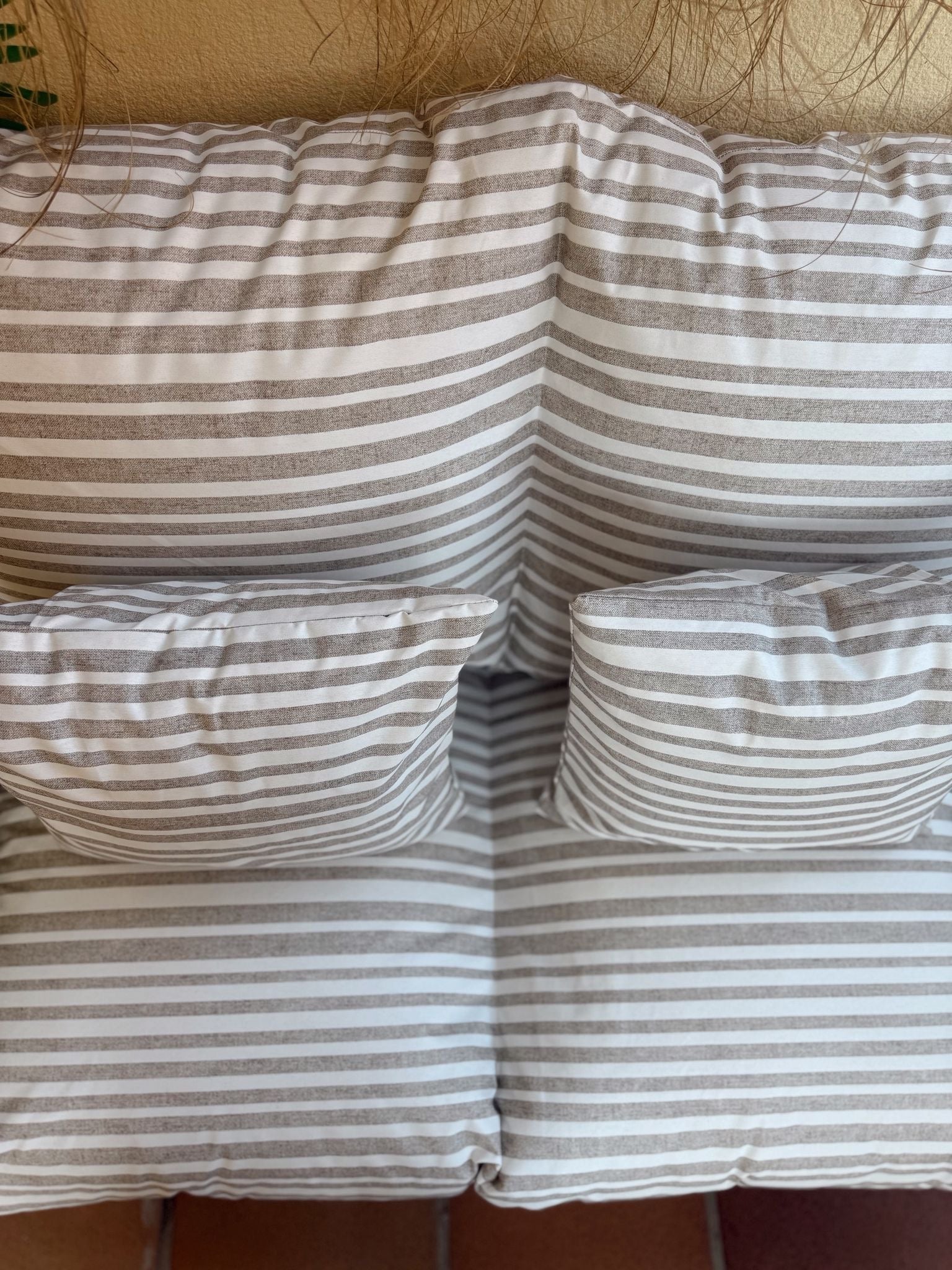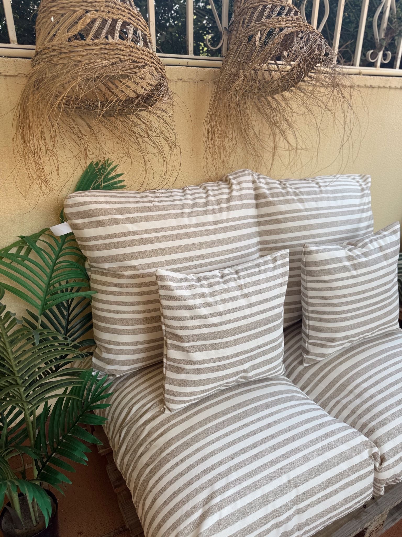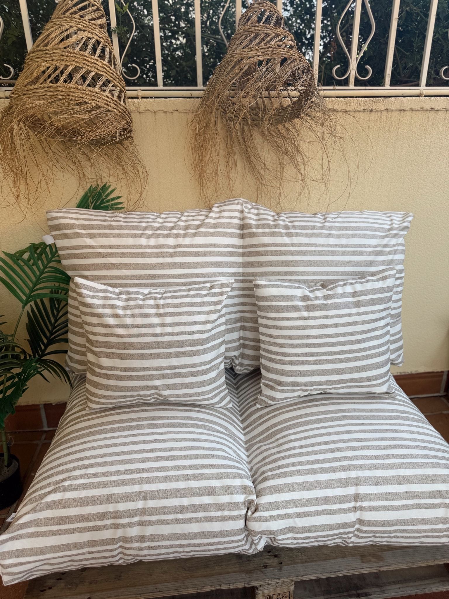 Los colchones para palets más vendidos ahora disponibles en tejido impermeable resinado y desenfundables con diseño rayas beige, ideales para terraza, jardín o piscina.La excelente resistencia del tejido, soporta el uso en exterior, bajo techo sin problemas.