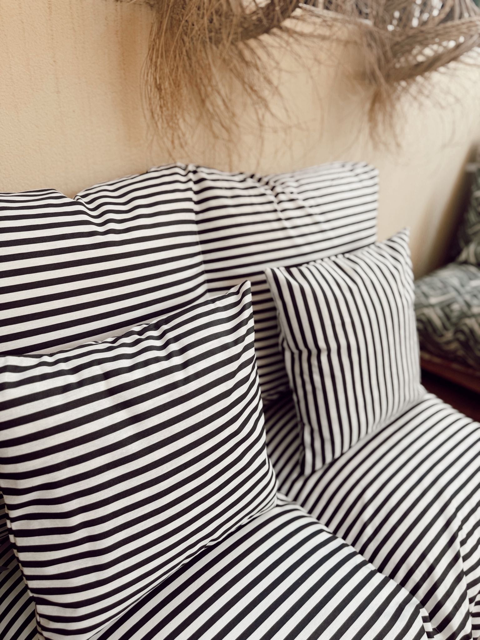 Los colchones para palets más vendidos ahora disponibles en tejido impermeable resinado y desenfundables con diseño rayas negras, ideales para terraza, jardín o piscina.La excelente resistencia del tejido, soporta el uso en exterior, bajo techo sin problemas.